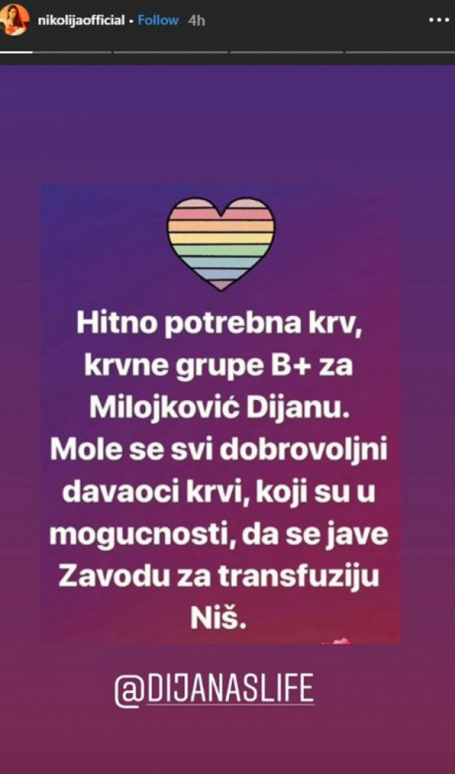 - Hitno potrebna krv, krvne grupe B+ za Milojković Dijanu. Mole se svi dobrovoljni davaoci krvi, koji su u mogućnosti, da se jave Zavodu za transfuziju Niš, apelovala je Nikolija putem društvene mreže i tagovala Dijanu.