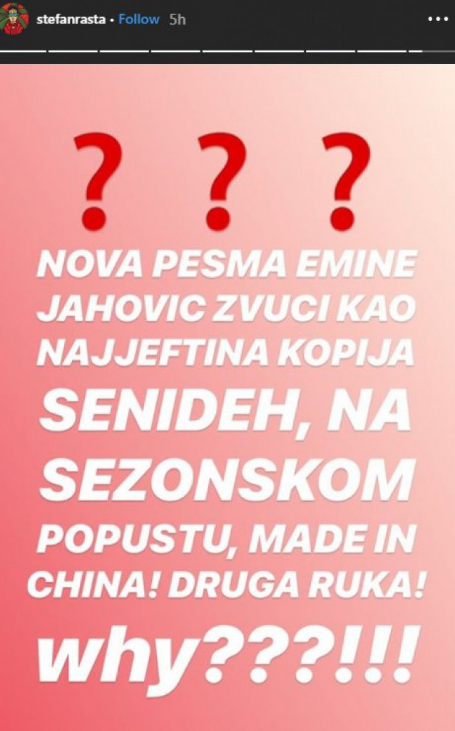 - Nova pesma Emine Jahović zvuči kao najjeftinija kopija Senidah, na sezonskom popustu! Made in China! Druga ruka! - napisao je reper na svom Instagramu.