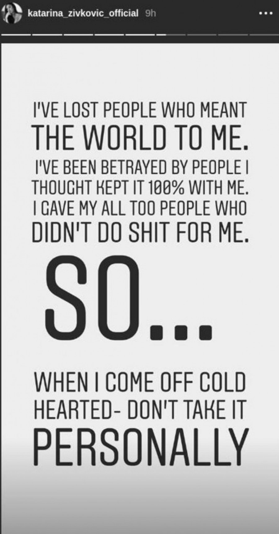 - Izgubila sam ljude koji su mi bili ceo svet. Izdali su me ljudi za koje sam mislila da su 100 posto uz mene. Dala sam sve ljudima koji ništa nisu uradili za mene. Tako da... Kada nastupim prema tebi hladnog srca - nije to ništa lično - napisala je Kaća.