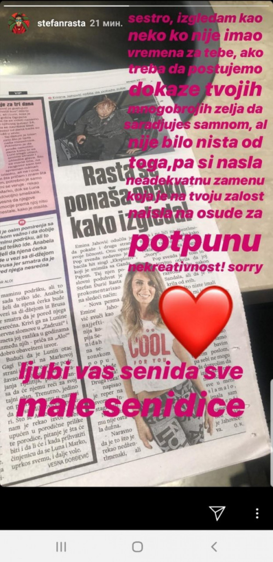 - Sestro, izgledam kao neko ko nije imao vremena za tebe! Ako treba da postujem dokaze tvojih mnogobrojnih želja da sarađuješ sa mnom, ali nije bilo ništa od toga, pa si našla neadekvatnu zamenu, koja je, na tvoju žalost, naišla na osude za potpunu nekreativnost. Ljubi vas Senida sve, male Senidice - stoji u reperovoj objavi na Instagramu.