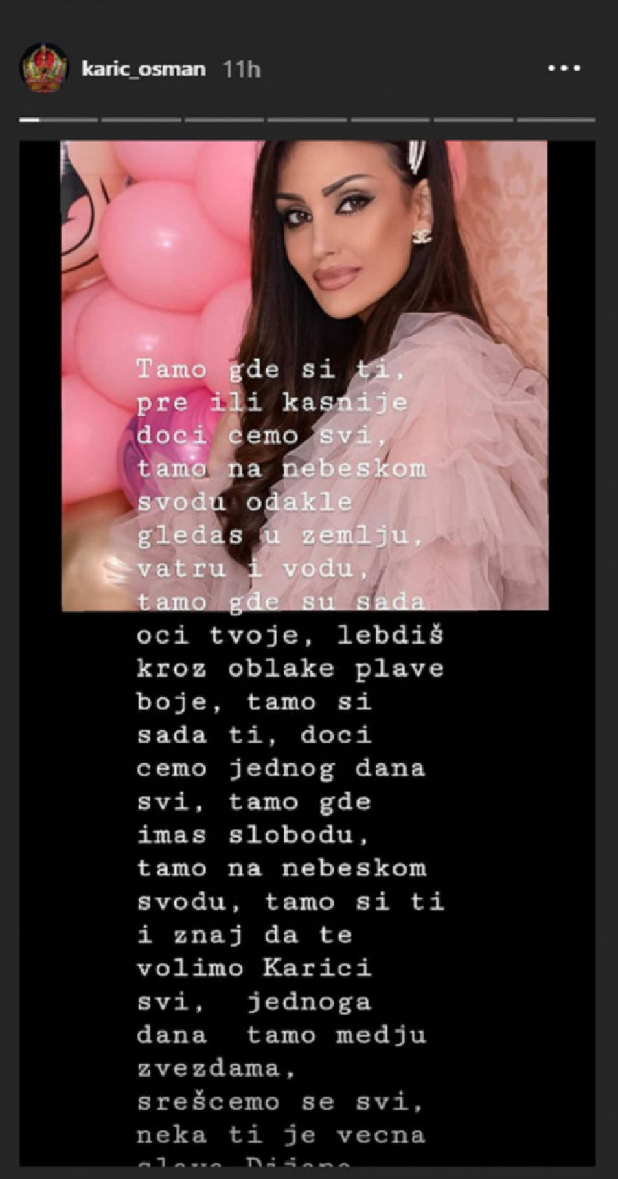 - Tamo gde si ti pre ili kasnije doći ćemo svi. Tamo na nebeskom svodu odakle gledaš na zemlju, vatru i vodu, tamo gde su sada oči tvoje, lebdiš kroz oblake plave boje. Tamo si sada ti, doći ćemo jednog dana svi, tamo gde imaš slobodu, tamo na nebeskom svodu. Tamo si ti i znaj da te volimo Karići svi. Jednog dana tamo među zvezdama srešćemo se svi. Neka ti je večna slava, Dijana - napisao je Osman.