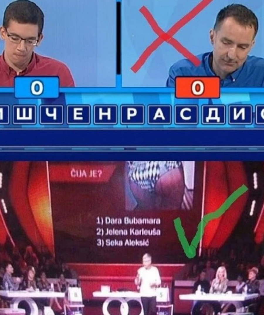 Foto: RTS/Grand TV/PrintskrinKorisnici društvenih mreža u velikom broju počeli su da dele ovu fotografiju i da u šali ovaj kviz porede sa popularnom "Slagalicom", te je tako nastala i fotomontaža koja je mnoge nasmejala.