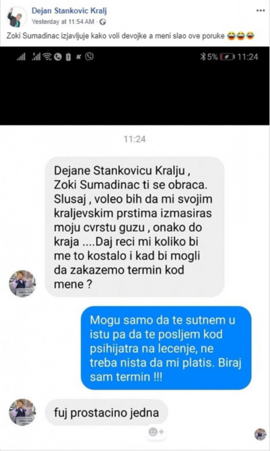 Dejan Stanković Kralj objavio je prepisku sa Zokijem Šumadincem u kojoj mu ovaj traži erotsku masažu.