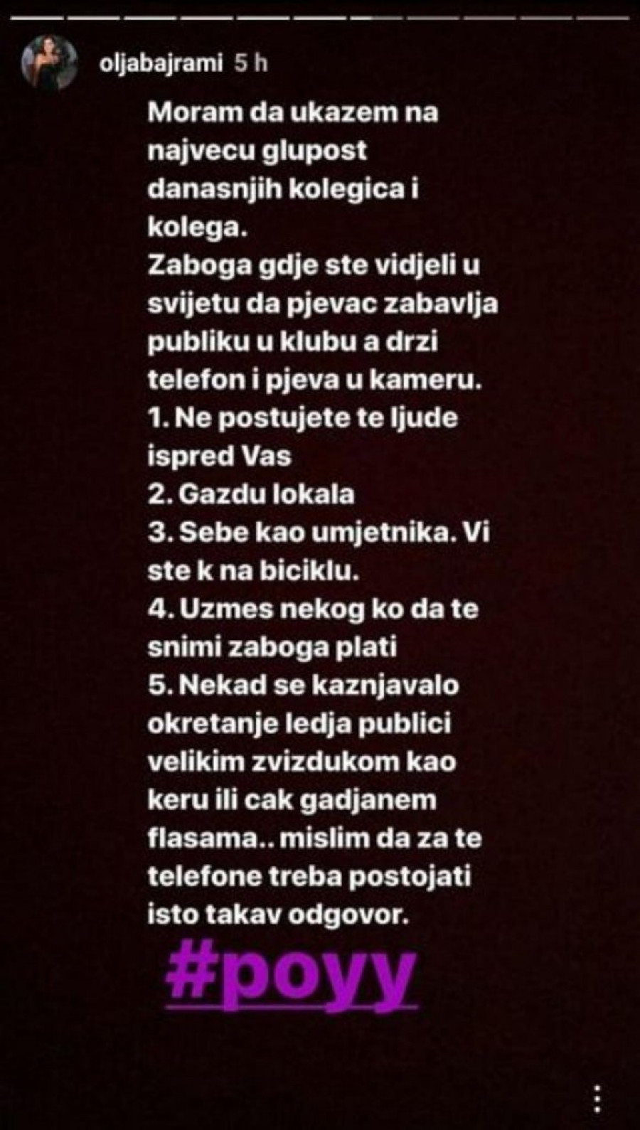 Olja Bajrami trenutno boravi u Budvi, a jedna stvar koju je primetila da pojedine njene kolege rade zapala joj je za oko i ne da joj nimalo mira. Iz tog razloga, rešila je da se oglasi javno i upita ih "gde su oni videli da to tako treba", u nadi da će prestati sa tom "najvećom gluposti".