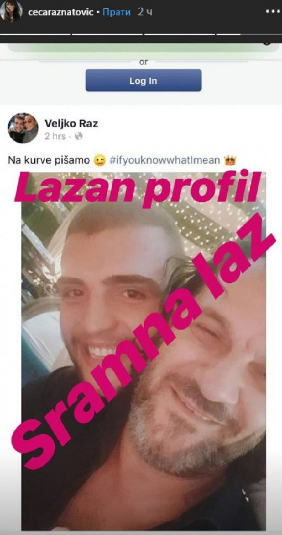 Na lažnom profilu Veljka Ražnatovića sinoć je osvanula njegova fotografija sa Acom Lukasom u opisu koje je bila psovka za koju su mnogi pomislili da se odnosi na Jelenu Karleušu koja je u toku jučerašnjeg dana imala okršaj sa folkerom.