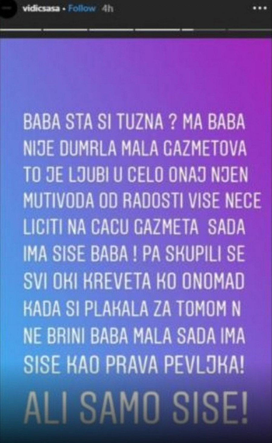 - Baba, šta si tužna? Ma, baba, nije dumrla mala Gazmetova (Gagi Đogani, prim. aut.). To je ljubi u čelo onaj njen mutivoda (Marko Miljković, prim. aut.) od radosti. Više neće ličiti na ćaću Gazmeta, sada ima sise, baba. Pa skupili se svi oko kreveta kao onomad kad si plakala za Tomom. Ne brini, baba, mala sada ima sise kao prava pevaljka. Ali samo sise! - napisao je modni kreator na svom Instagram profilu.