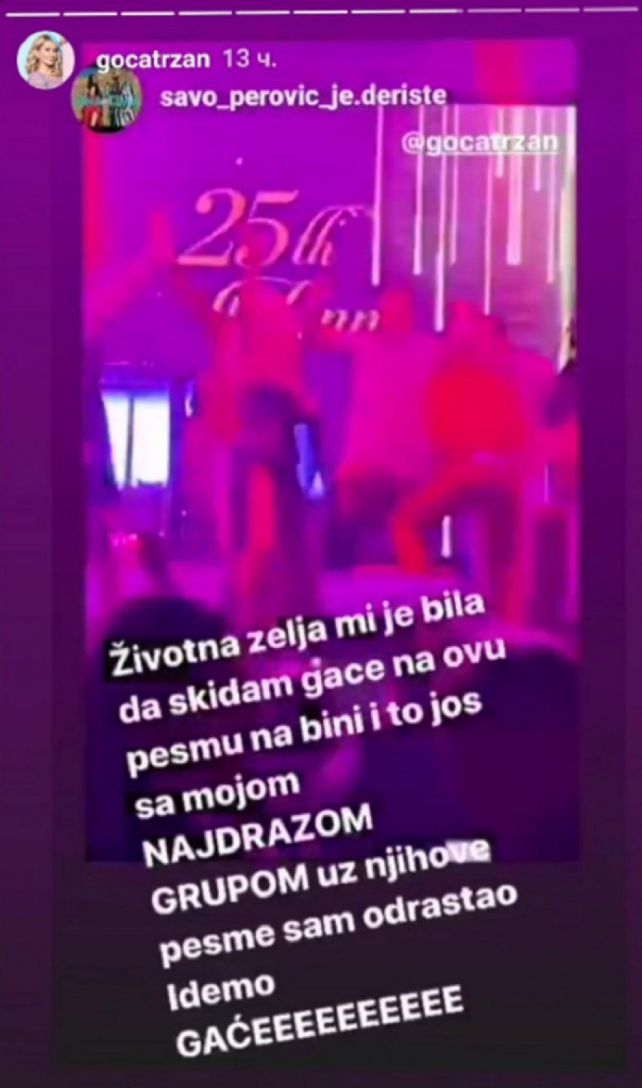 - Životna želja mi je bila da skidam gaće na ovu pesmu na bini i to još sa mojom NAJDRAŽOM GRUPOM! Uz njihove pesme sam odrastao. Idemo GAĆEEE - napisao je Perović, a Goca Tržan je njegovu objavu podelila i na svom storiju.
