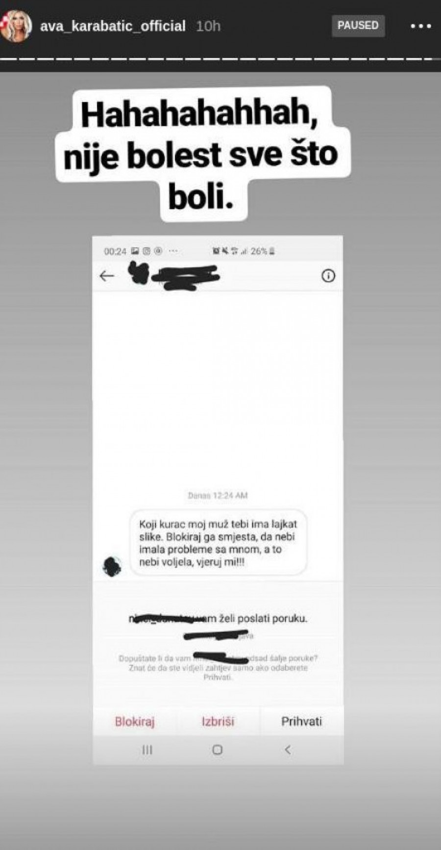 - Koji ku*ac moj muž ima tebi lajkovati slike. Blokiraj ga smesta, da ne bi imala probleme sa mnom, a to ne bi volela, veruj mi - glasila je poruka, na koju je Ava naravno imala odgovor. Sudeći po ovome, Ava ipak nije u strahu: