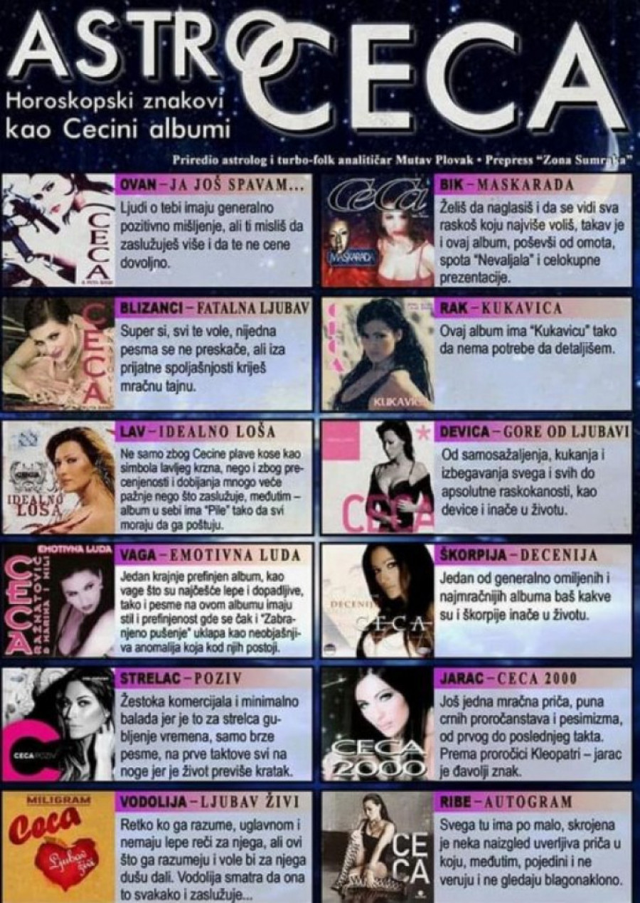 Na društvenim mrežama je osvanuo horoskop, koji, uporedo sa znacima, nosi nazive hitova Svetlane Cece Ražnatović.