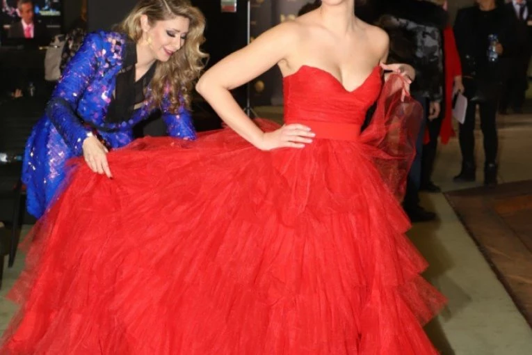 Naime, voditeljka je za ovaj događaj izabrala dugu, roze haljinu sa šljokicma, koja joj je isticala bujno poprsje.