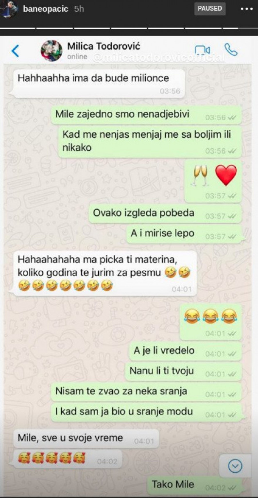 Foto: instagram.com/printscreenKada je pesma ugledala svetlost dana, publika je očekivano bila oduševljena, kao i njih dvoje. Bane je na svom Instagramu objavio deo prepiske sa Milicom, gde mu ona, na šaljiv način zamera koliko dugo ga je jurila da joj uradi neku pesmu.