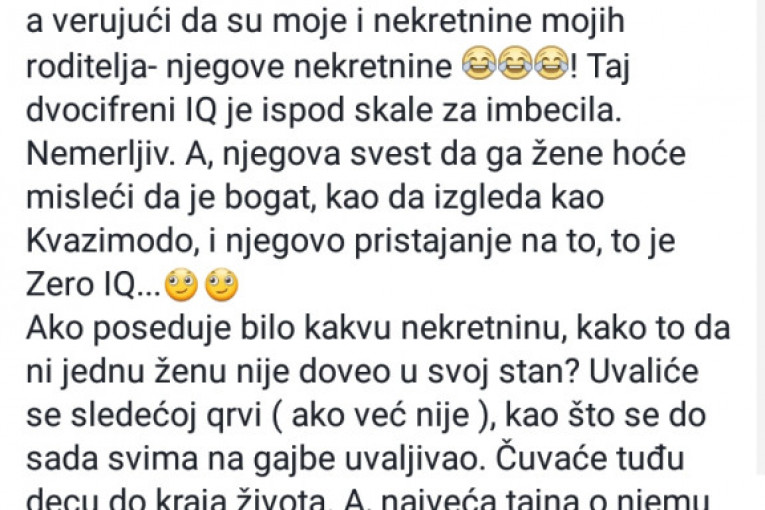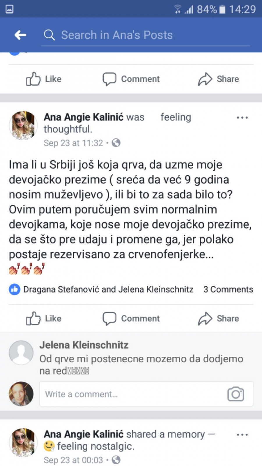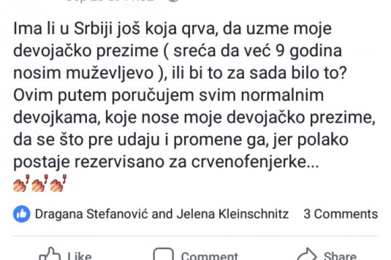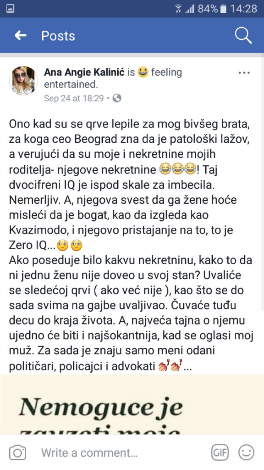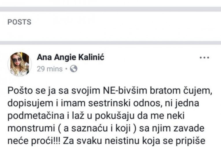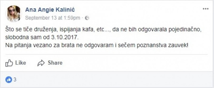 Podsećamo, ekipa Srpskog telegrafa danas je objavila tekst u kojem je objašnjeno na koji način je Lukina sestra na društvenoj mreži Fejsbuk vređala snajku Natašu Bekvalac, iznoseći niz ureda na njen račun. Posle toga je sve objave povukla sa Fejsbuka, osim jedne koja joj je promakla a odnosi se na 13. septembar, gde je javno napisala da na pitanja vezana za svog brata seče poznanstva zauvek.