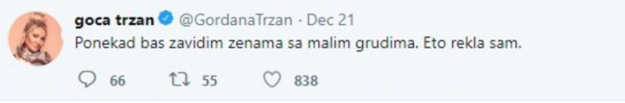 Foto: twitter.com/printscreen- Ponekad baš zavidim zenama sa malim grudima. Eto rekla sam- napisala je Goca, pa kada su je fanovi pitali zbog čega, kratko je odgovorila: