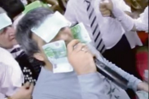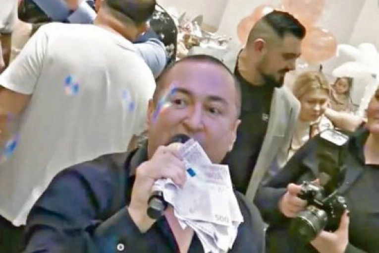 Foto: printscreen- Kako je počeo sa ovom pesmom tako su svi počeli da mu prilaze i da mu u ruku stavljaju po 500 evra. Nije bila nijedna druga novčanica, kitili su ga isključivo sa ljubičastim evrićima. On se izgubio jer nije očekivao toliko bakšiš na samo početku proslave, pa je i sam prokomentarisao: "Odoh ja kući, dosta je bilo, ne treba mi više", našalio se on i krenuo ka vratima, što su svi pozdravili aplauzom.