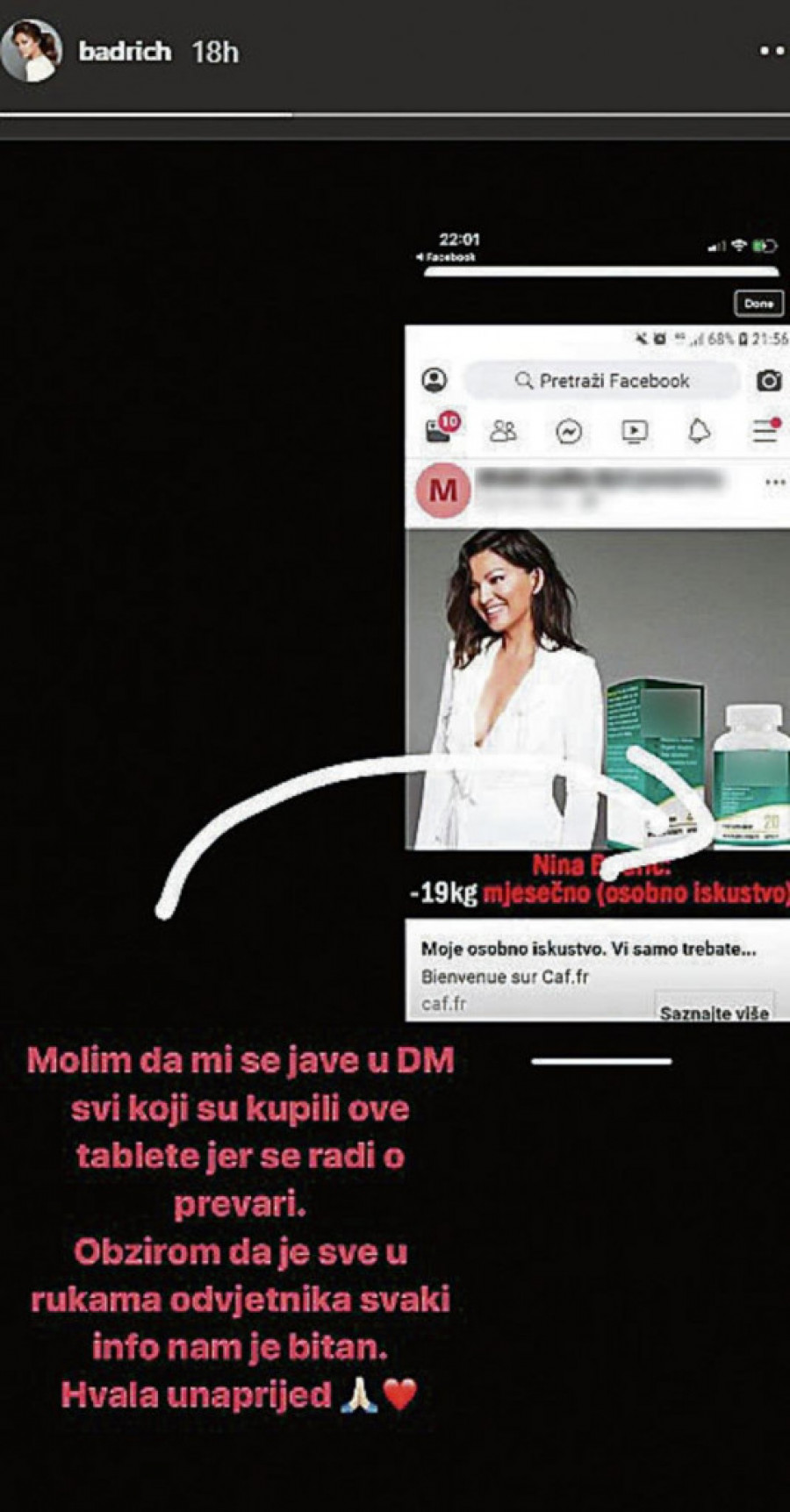 Pevačicu Ninu Badrić iskoristila je jedna kompanija koja se bavi preparatima za mršavljenje. Stavili su njenu sliku kao reklamni proizvod, a da Ninu nisu obavestili o tome.
