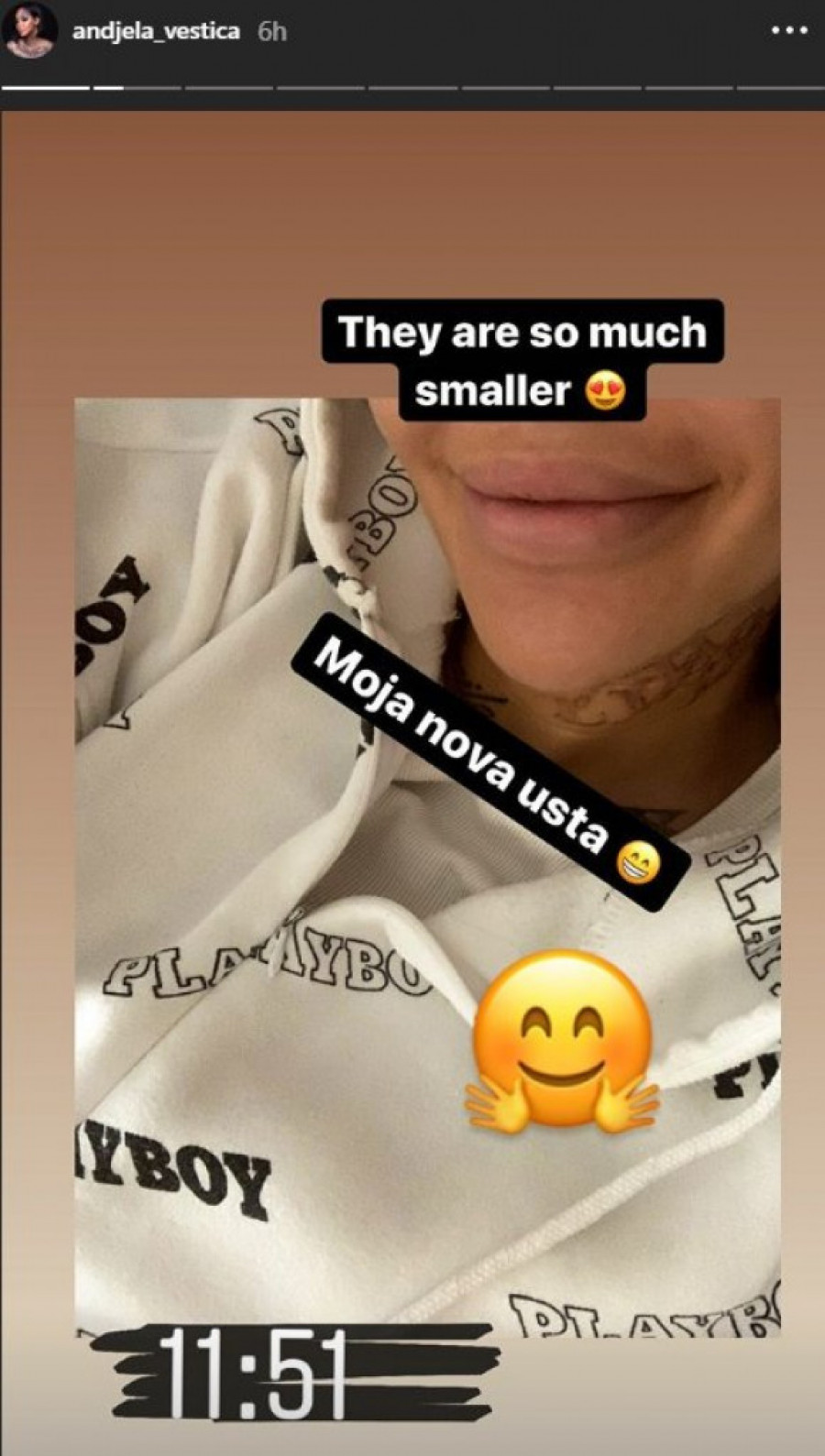- Moja nova usta - napisala je Anđela na svom Instagram storiju, a u opisu fotografije dodala: "Mnogo su manja".