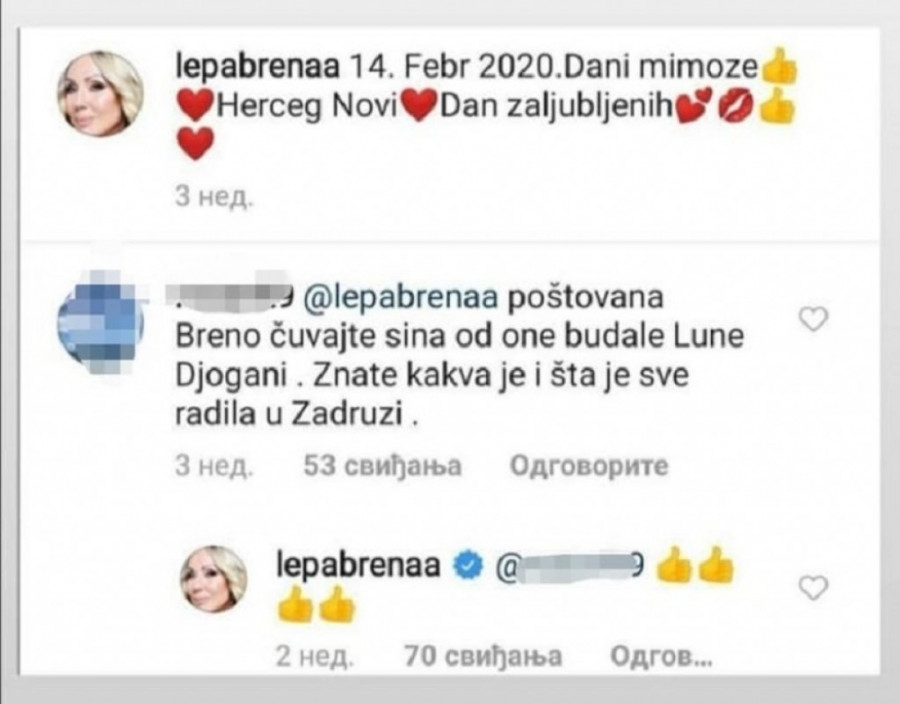 - Poštovana Breno čuvajte sina od one budale Lune Đogani. Znate kakva je i šta je sve radila u Zadruzi - piše u komentarima ispod Brenine objave na društvenim mrežama.