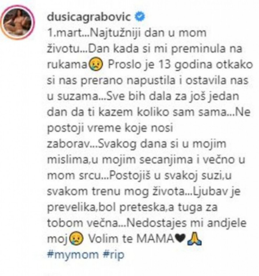 - 1.mart...Najtužniji dan u mom životu...Dan kada si mi preminula na rukama. Proslo je 13 godina otkako si nas prerano napustila i ostavila nas u suzama...Sve bih dala za još jedan dan da ti kazem koliko sam sama...Ne postoji vreme koje nosi zaborav...Svakog dana si u mojim mislima,u mojim sećanjima i večno u mom srcu...Postojiš u svakoj suzi,u svakom trenu mog života...Ljubav je prevelika, bol preteška,a tuga za tobom večna...Nedostaješ mi anđele moj. Volim te MAMA❤ - napisala je pevačica.