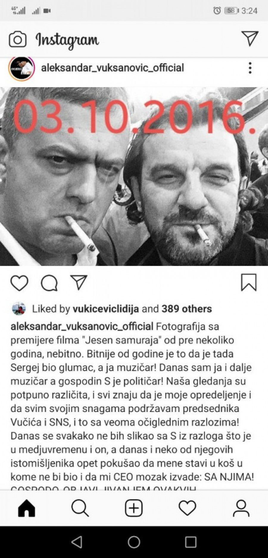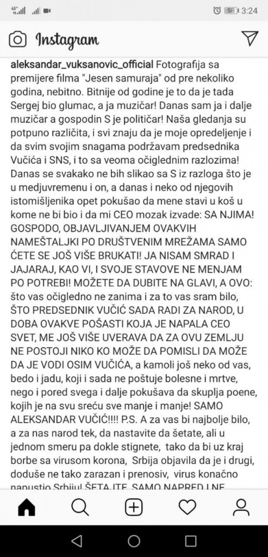 - Fotografija sa premijere filma "Jesen samuraja" je od pre nekoliko godina, nebitno. Bitnije od toga je da je Sergej bio glumac, a ja muzičar! Danas sam ja i dalje muzičar, a gospodin S je političar. Naša gledanja su potpuno drugačija, svi znaju da je moje opredeljenje i da svim srcem podržavam Aleksandra Vučića i SNS i to sa veoma očiglednim razlozima! Danas se svakako ne bih slikao sa S iz razloga što je on u međuvremenu, a danas i od neko od njegovh istomišljenika opet mene pokušao da stavi u koš u kome ne bi bio i da mi ceo mozak izvade. SA NJIMA.
