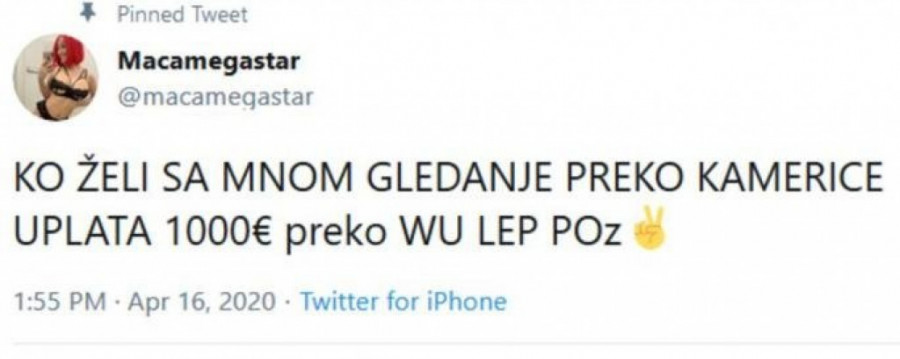 - Ko želi sa mnom gledanje preko kamerice uplata 1000 evra. Lep pozdrav - napisala je Nurkićeva na svom Tviter profilu.