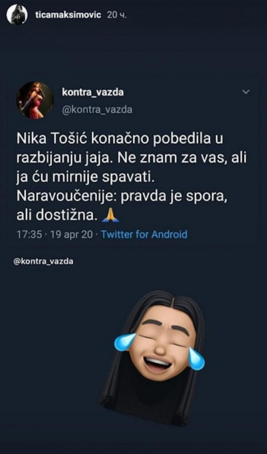 – Nika Tošić konačno pobedila u razbijanju jaja. Ne znam za vas, ali ja ću mirnije spavati. Naravoučenije: Pravda je spora, ali dostižna – piše u objavi koju je Ajfonka podelila.