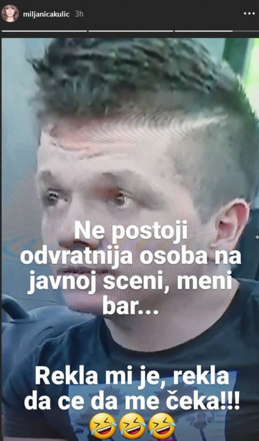 - Ne postoji odvratnija osoba na javnoj sceni, meni bar... 'Rekla mi je, rekla, da će da me čeka" - napisala je Miljana preko fotografije Radanovića koju je objavila u vidu Instagram storija.