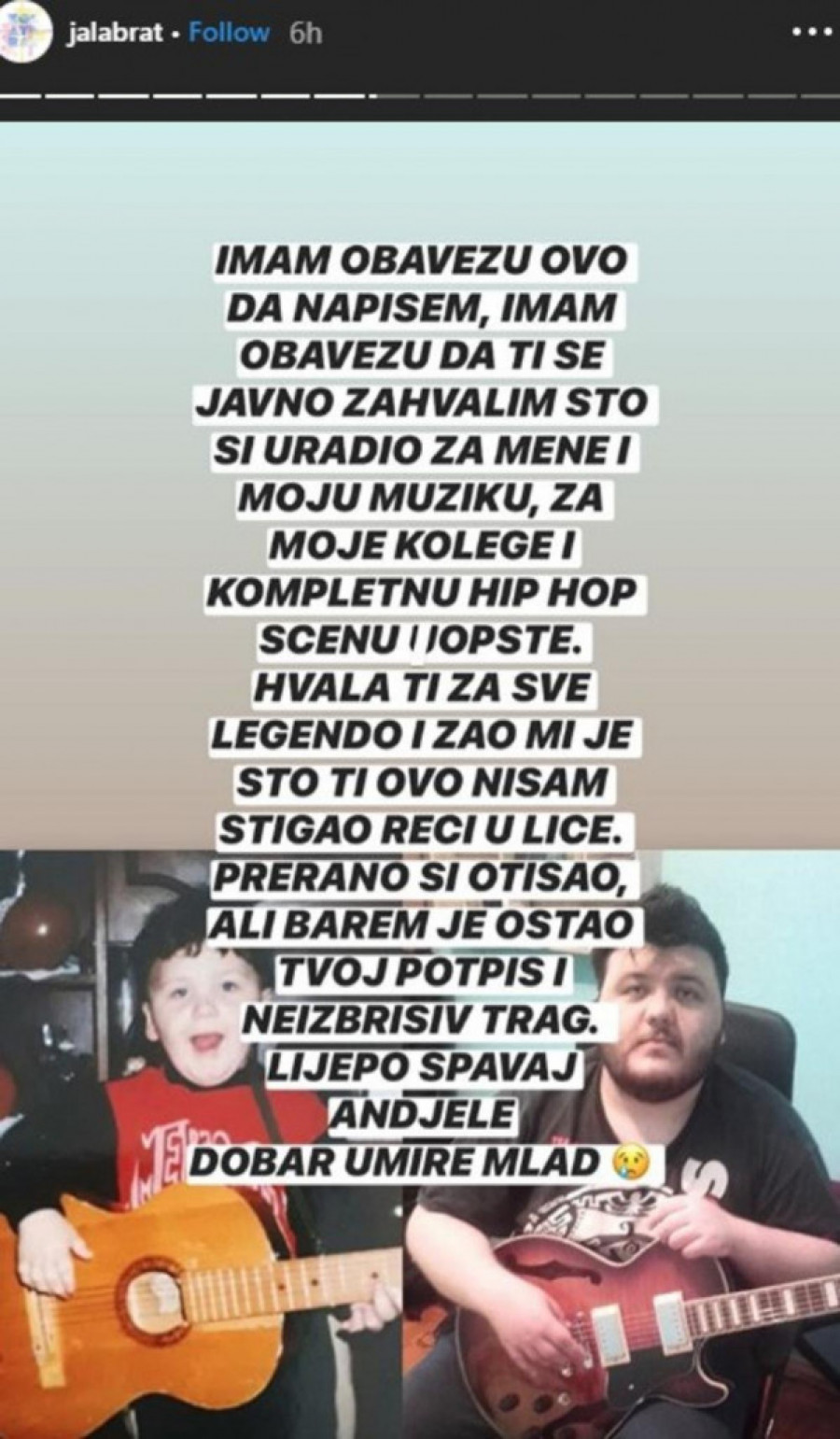 Foto: instagram.com/printscreen- Imam obavezu da ovo javno napišem, imam obavezu da ti se javno zahvalim za sve što si uradio za moju muziku, mene, moje kolege i kompletnu hip hop scenu uopšte. Prerano si otišao, ali bar je ostao tvoj potpis. Lepo spavaj anđele, dobar umire mlad - napisao je Džala brat na Instagramu.