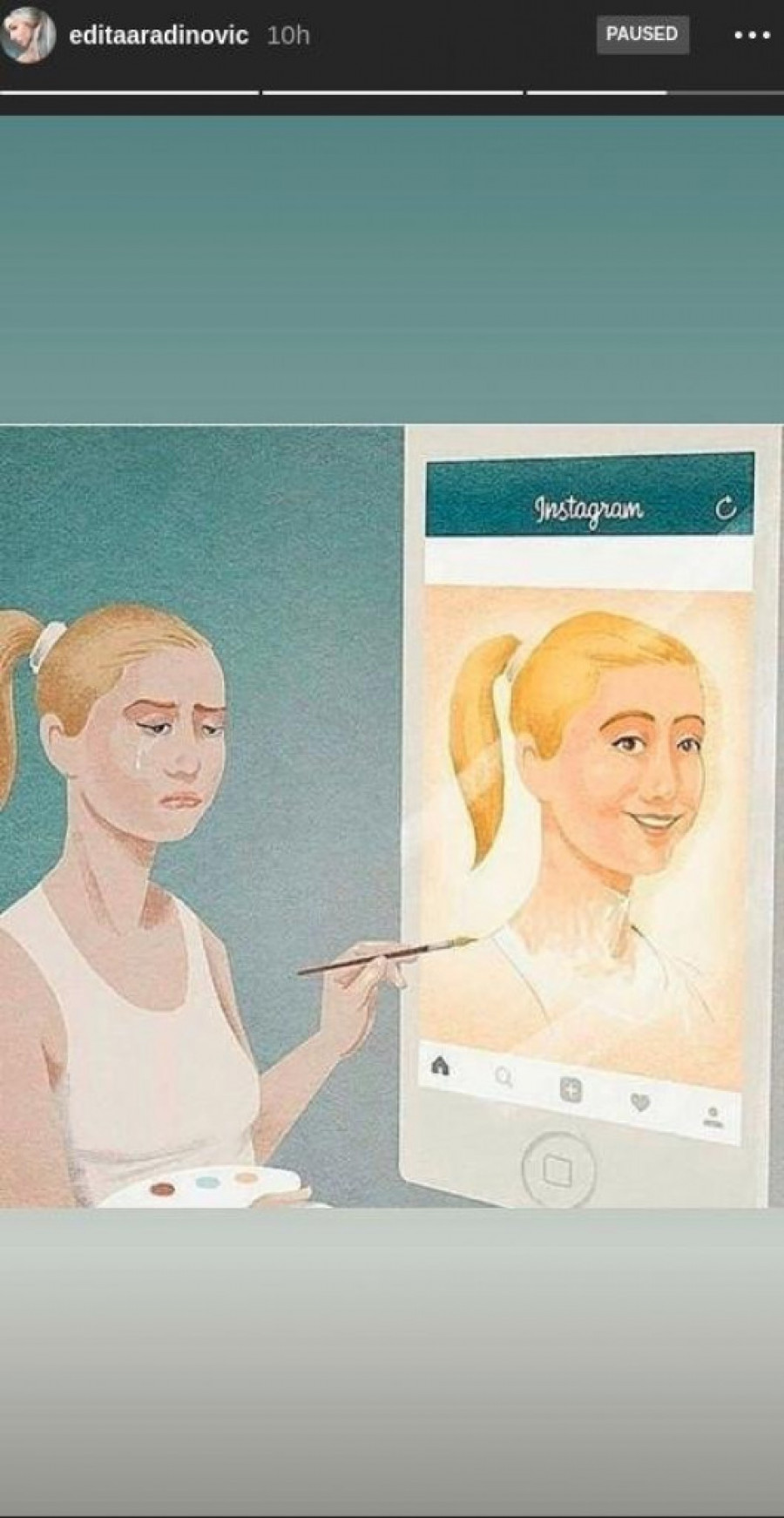 Ona je objavila ilustraciju na kojoj se vidi da se devojka pravi da je srećna, dok je zapravo veoma tužna. Ipak, njena slika sa Instagrama širokog osmeha, pokazujući svima lažnu sliku o sebi.