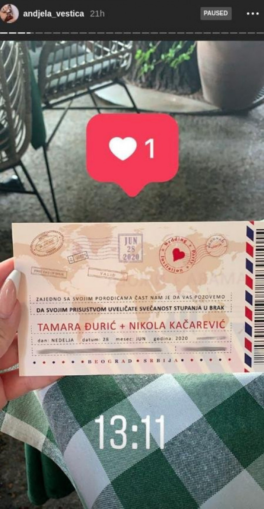 Foto: instagram.com/printscreen- Zajedno sa svojim porodicama, čast nam je da vas pozovemo da svojim prisustvom uveličate svečanost stupanja u brak Tamare Đurić i Nikole Kačarevića - piše na pozivnici, uz naravno datum, mesto i vreme održavanja svečanosti.