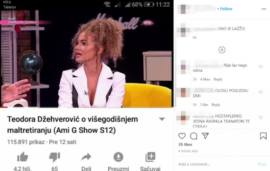 - Pa recimo samo jedna od njih je: "Razapecemo te ku**o"! Zaista strašno. Duševni nemir koji je nanesen i meni, mojim prijateljima i mojoj porodici, a niko nema prava na to. Mislim da to nisam zaslužila jer nikom ništa loše nisam uradila. Ta devojka je bila je ispred mog stana, slikala moju terasu, angažovala sam advokate i sve je sada prepusteno sudovima, ali prosto sam to morala da podelim sa javnošću - izjavila je Teodora ovom prilikom.