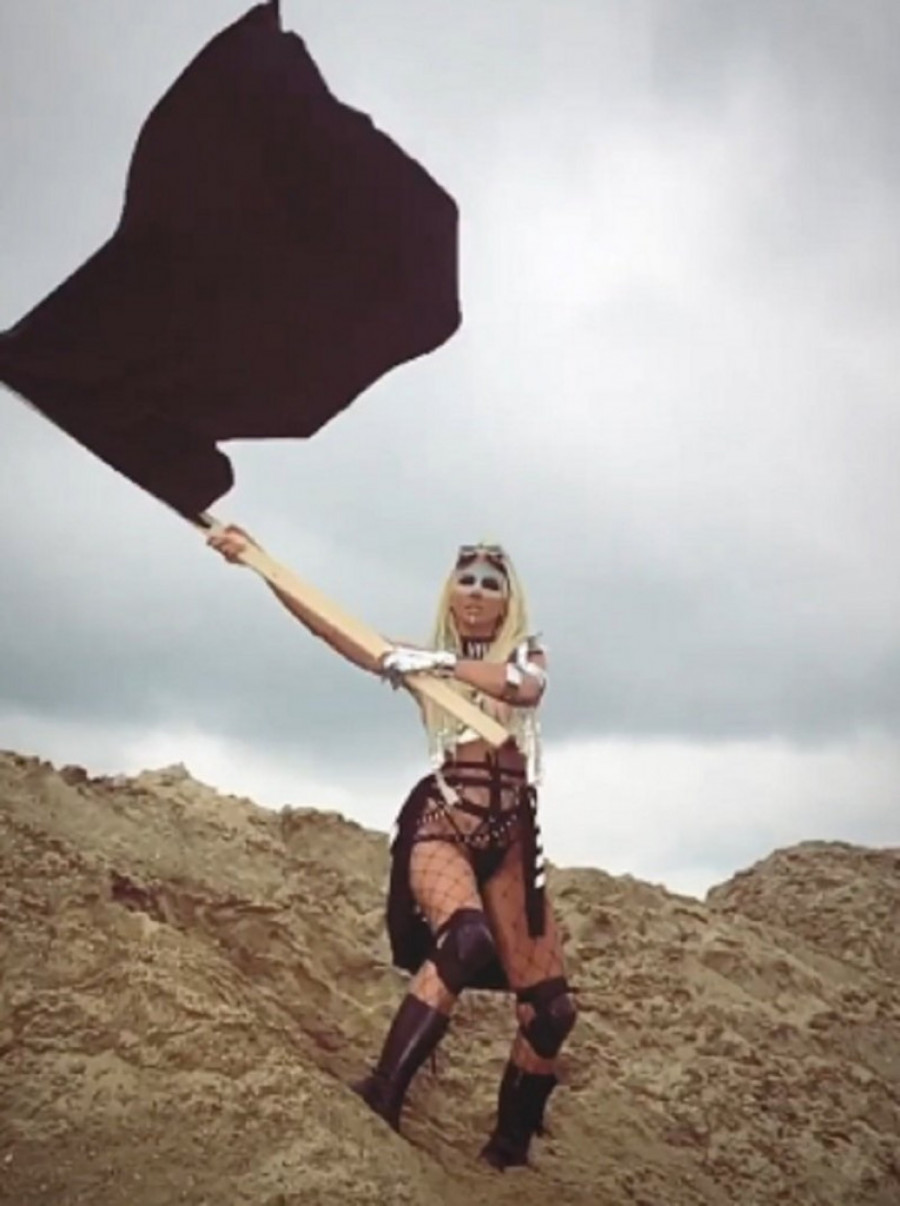Obučena u gaćice, mrežaste čarape, cokule i našminkana kao Šarliz Teron u rimejku hit filma "Pobesneli Maks", Jelena je pozirala na motoru i okružena podjednako oskudno odevenim igračicama.