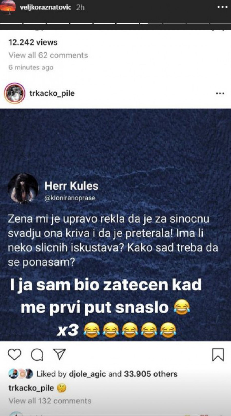 - Žena mi je upravo rekla da je ona kriva za sinoćnu svađu i da je preterala! Ima li neko sličnih iskustava - glasi citat koji je Veljko postavio a na koji je i odgovorio: