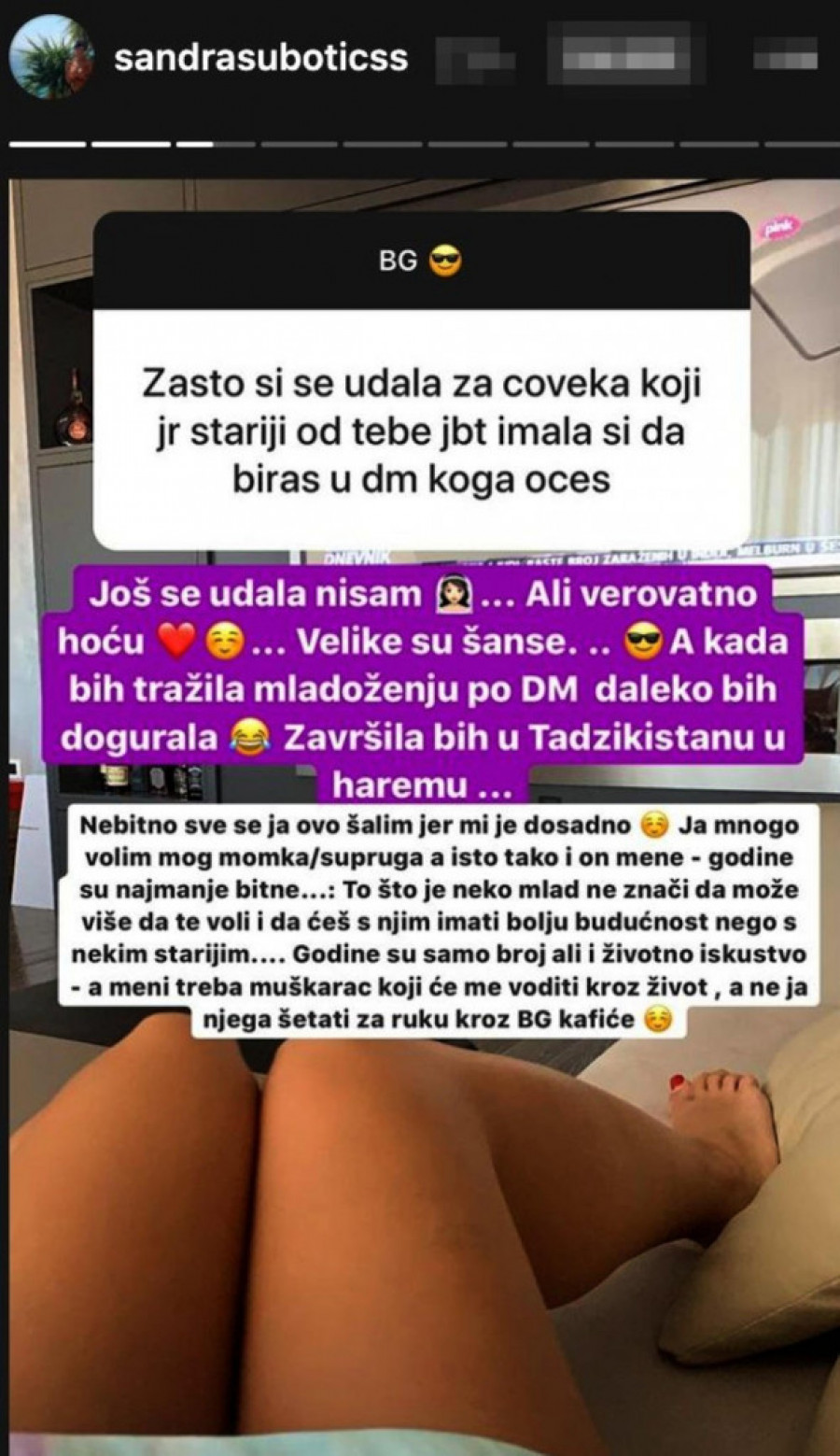 - Još se udala nisam, ali verovatno hoću. Velike su šanse. A kada bih tražila mladoženju po Instagramu, daleko bih dogurala. Završila bih u Tadžikistanu, u haremu. Nebitno, sve se ja ovo šalim, jer mi je dosadno. Ja mnogo volim mog momka/supruga, a isto tako i on mene - godine su najmanje bitne. To što je neko mlad, ne znači da može više da te voli i da ćeš sa njim imati bolju budućnost nego s nekim starijim. Godine su samo broj, ali i životno iskustvo - a meni treba muškarac koji će me voditi kroz život, a ne ja njega šetati za ruku, kroz beogradske kafiće - rekla je Sandra.