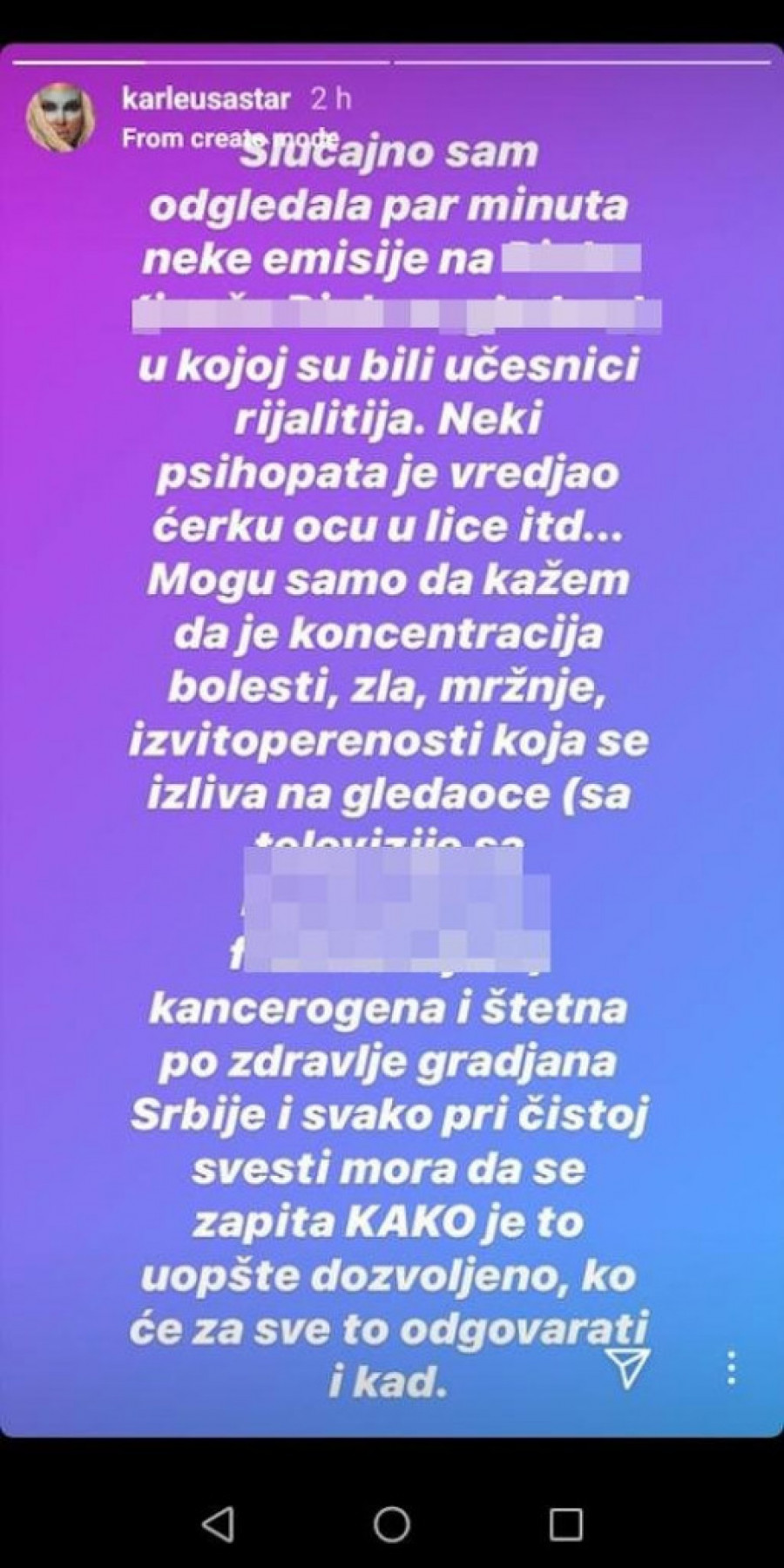 Foto: Instagram/printscreenOvoga puta ona je podelila sa svojim pratiocima da je uhvatila deo emisije u kojoj su gošće bili Marko Đedović i Gagi Đogani, a ono što ju je posebno šokiralo jeste naćin na koji je dotični zadrugar govorio o ćerki svog bivšeg cimera.