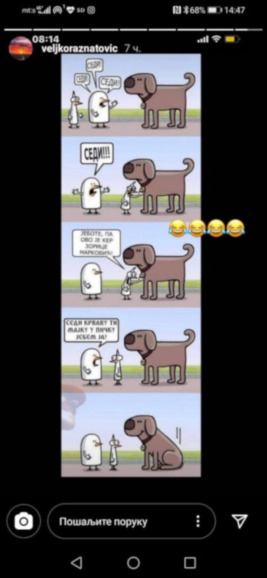 Foto: Instagram/printscreenVeljko vrlo često ima običaj da na svom Instagram profilu podeli humorističke ilustracije izvesnih situacija, pa je tako i ovoga puta obajvio fotografiju na kojoj pas ne sluša komande.
