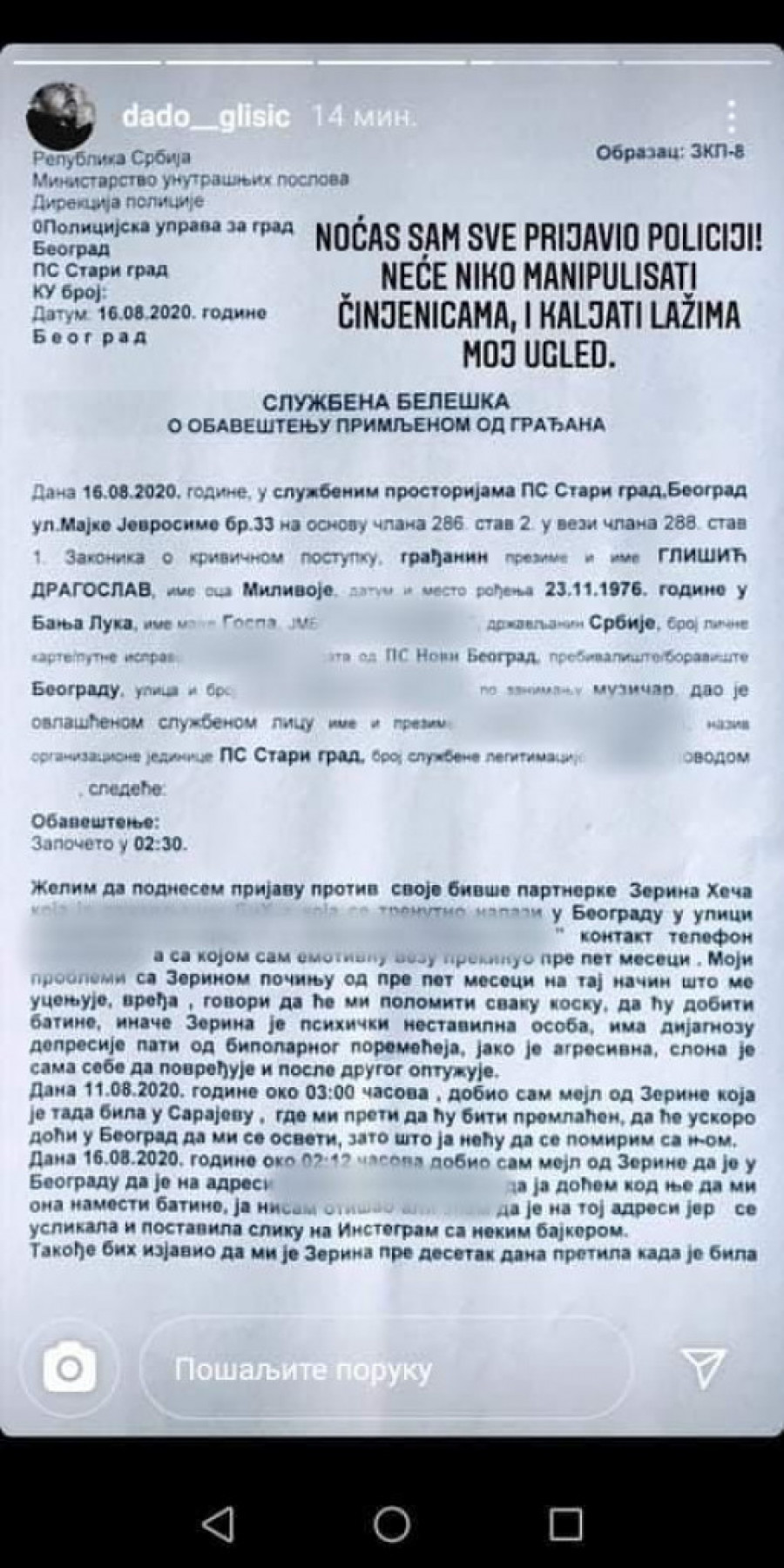 - Noćas sam sve prijavio policiji! Neće niko manipulisati činjenicama i kaljati lažima moj ugled - napisao je Dado.