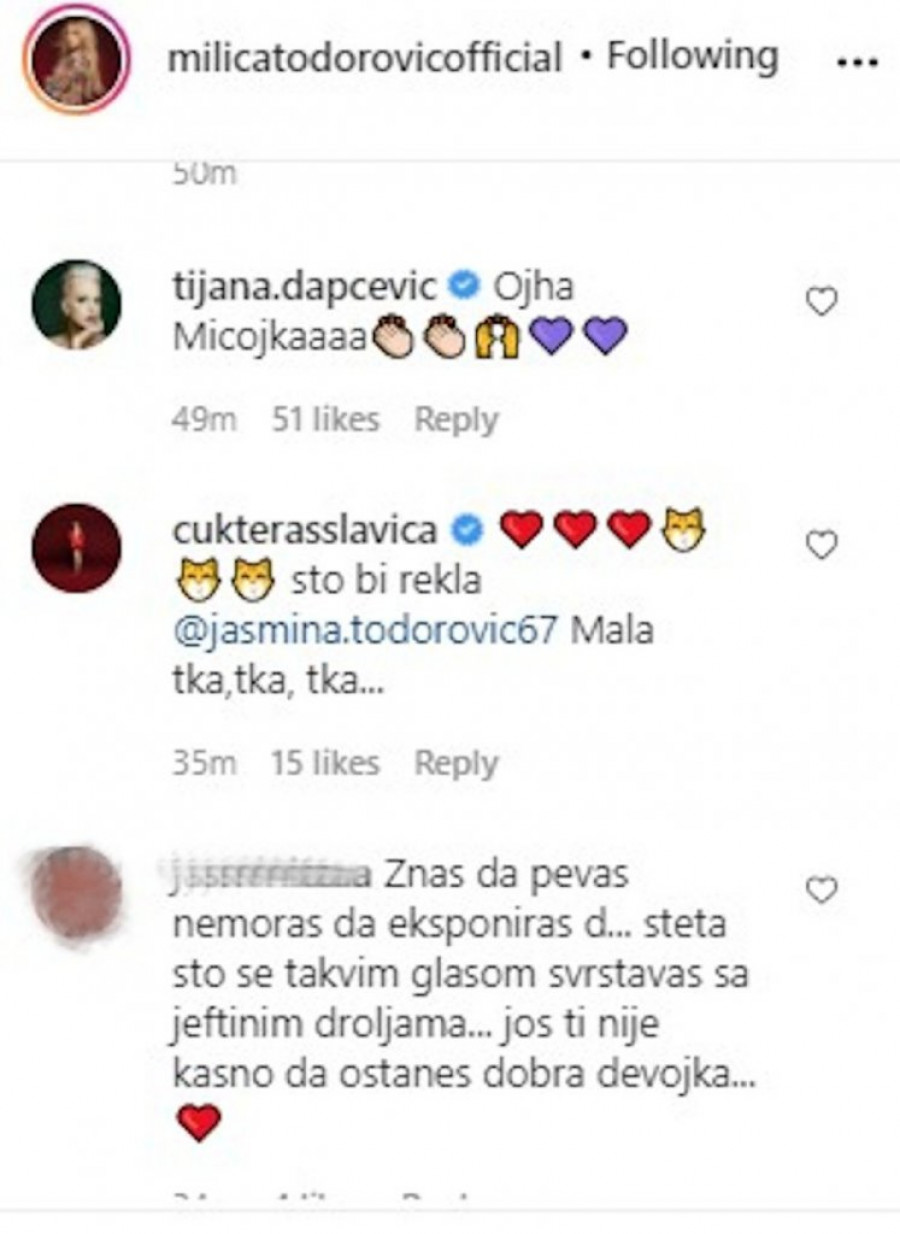 - Znaš da pevaš. Ne moraš da eksponiraš d*pe. Šteta što se sa takvim glasom svrstavaš sa jeftinim dr*ljama. Još ti nije kasno da ostaneš dobra devojka - istaknuto je u komentaru.