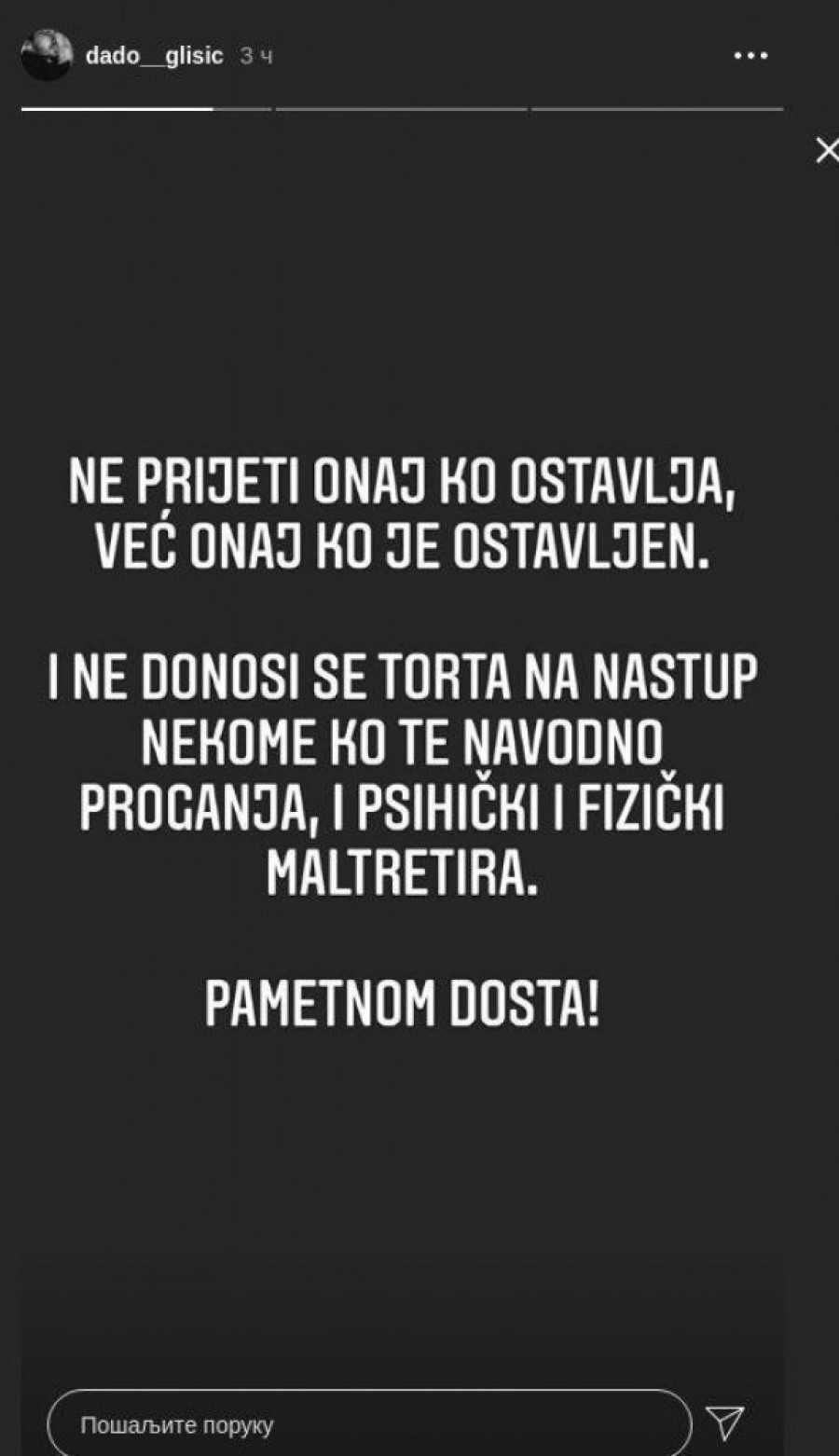 - Ne preti onaj ko ostavlja, već onaj ko je ostavljen... I ne donosi se torta na nastup nekome ko te navodno proganja i psihički i fizički maltretira. Pametnom dosta - glasio je prvi status Glišića, a onda najavio i svoje oglašavanje: