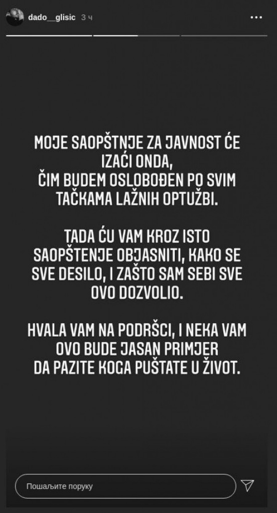 - Moje saopštenje za javnost će izaći onda čim budem oslobođen po svim tačkama lažnih optužbi. Tada ću vam kroz isto saopštenje objasniti kako se sve desilo i zašto sam sebi sve ovo dozvolio. Hvala vam na podršci i neka vam ovo bude jasan primer da pazite koga puštate u život - poručio je Dado na Instagramu.