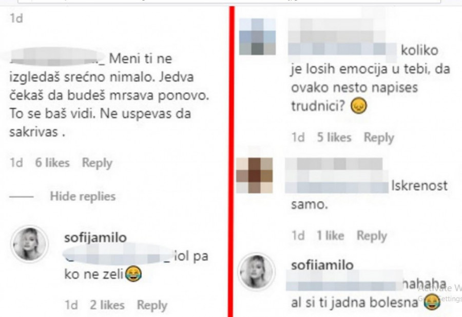 Foto: instagram.com/printscreenIpak, gospođa je nastavila da niže negativne komentare, što su mnogi osudili, a Sofija joj je poručila da je bolesna.
