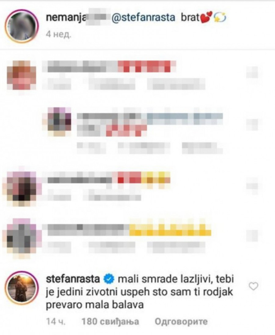 - Mali smrade lažljivi, tebi je jedini životni uspeh, što sam ti rođak. Prevaro, mala, balava - napisao je Rasta.