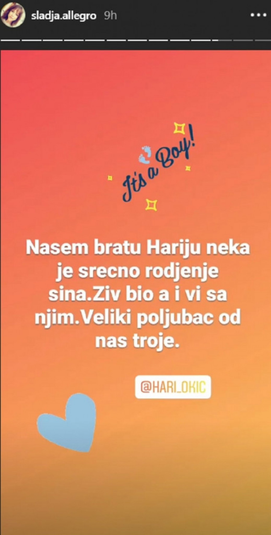 - Našem bratu Hariju neka je srećno rođenje sina. Živ bio, a i vi sa njim. Veliki poljubac od nas troje - napisala je Slađa, dodavši uz jedno plavo srculence.