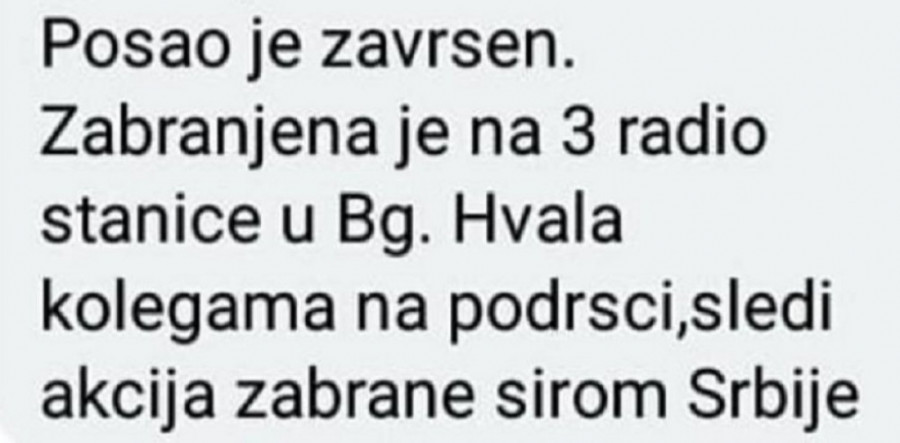 – Posao završen. Zabranjena je na tri radio stranice u Beogradu. Hvala kolegama na podršci, sledi akcija zabrane širom Srbije - stoji u jednom od komentara na mreži "Facebook".