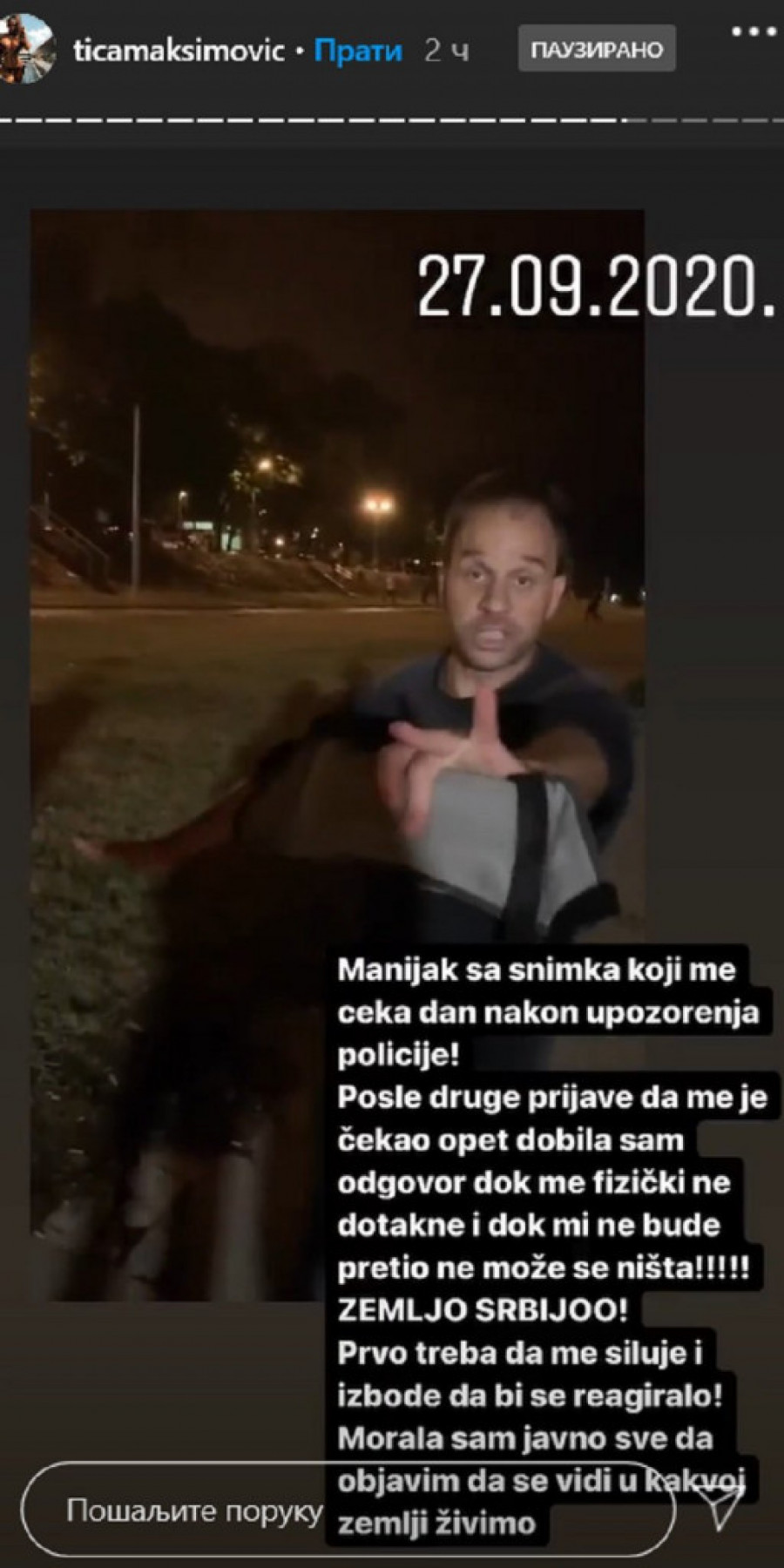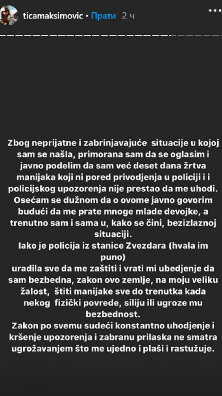Foto: instagram.com/printscreen- Iako me je uhođenje tog čoveka istraumiralo, bila sam ubeđena da su ga upozorenje policije i privođenje uplašili dovoljno da mi nikada više ne priđe. Izašla sam uveče, na društvenoj mreži objavila na kom sam splavu, a on se pojavio tamo. Nije mi bilo dobro. Ne znam kako sam uspela da ostanem na nogama i snimim ga telefonom kako bih dokaze da je prekšio zabranu prilaska pokazala policiji. On je psihički bolesnik što se vidi iz snimka koji sam napravila i strahujem za svoju bezbednost. Sreća, pa sam na splavu bila u društvu prijatelja. Strah me je da se krećem i ponovo sam bila u policiji kako bih ih zamolila da što hitnije reaguju i zaštite me od manijaka - istakla je starleta za „Alo!“.
