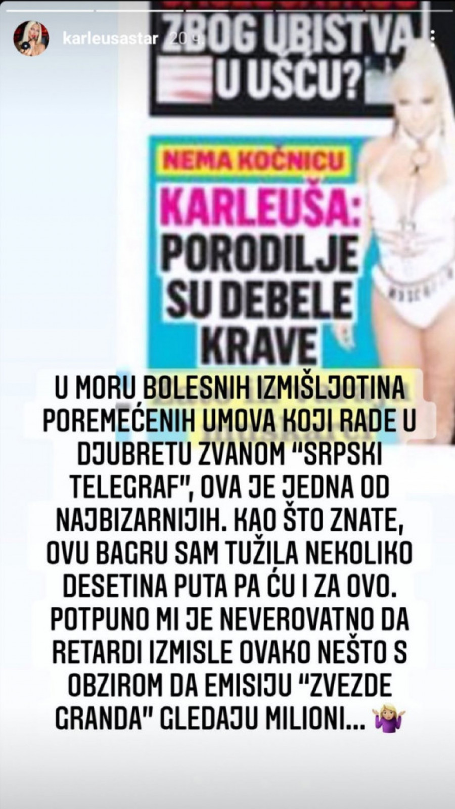 - Potpuno mi je neverovatno da izmisle ovako nešto s obzirom na to da emisiju "Zvezde Granda" gledaju milioni - pravdala se Karleuša putem Instagrama, zaboravljajući da je upravo i ukopalo to što je mnogo ljudi čulo i videlo šta je i kako rekla, zbog čega svi koji su to videli danima ne prestaju da se zgražavaju nad njenim činom.