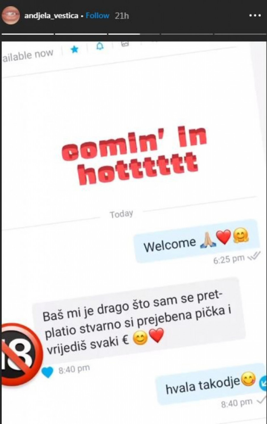 Foto: instagram.com/andjela_vestica- Baš mi je drago što sam se pretplatio, stvarno si prej*bena pi*ka - glasio je komentar.