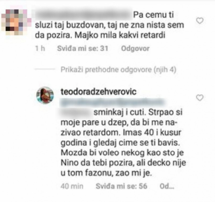 "Šminkaj i ćuti. Strpao si moje pare u džep da bi me nazivao retardom. Imaš 40 i kusur i gledaj čime se ti baviš. Možda bi voleo nekog kao što je Nino da tebi pozira, ali dečko nije u tom fazonu. Žao mi je!", napisala je Teodora i pridobila oko stotinu lajkova.