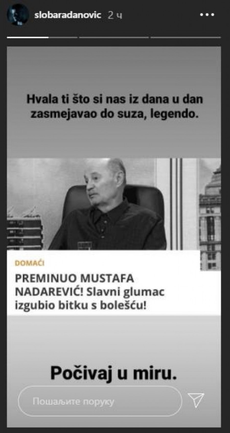 Sloba Radanović se oglasio na svom Instagram profilu, kako bi izjavio da mu je žao zbog smrti glumca Mustafe Nadarevića.