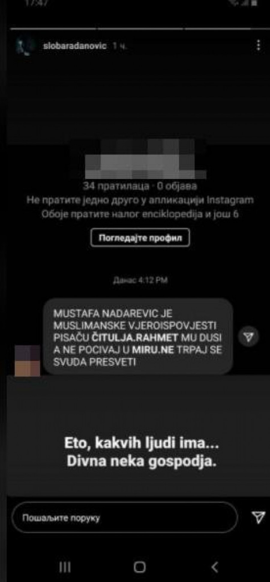 - Mustafa Nadarević je muslimanske vjeroispovesti, pisaču čitulja. Rahmet mu duši, a ne počivaj u miru. Ne trpaj se svuda, presveti - bila je poruka koju je Radanović dobio, na šta je prokomentarisao: