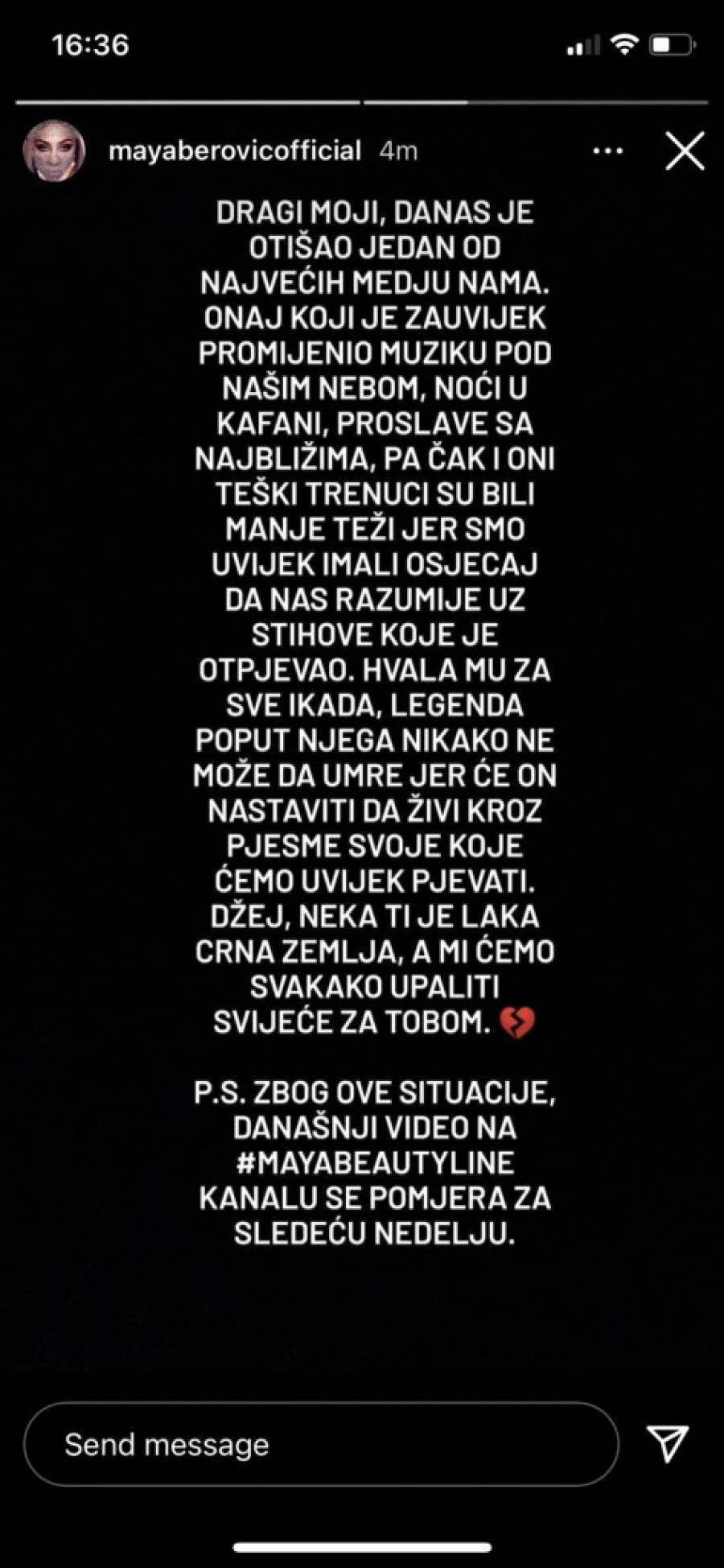 Foto: instagram.com/mayaberovicofficialOsim emotivnog oproštaja od Džeja, Maja je fanove obavestila i da odlaže promociju na svom kanalu koja je zakazana za danas. Smatra da sada nije trenutak za to.